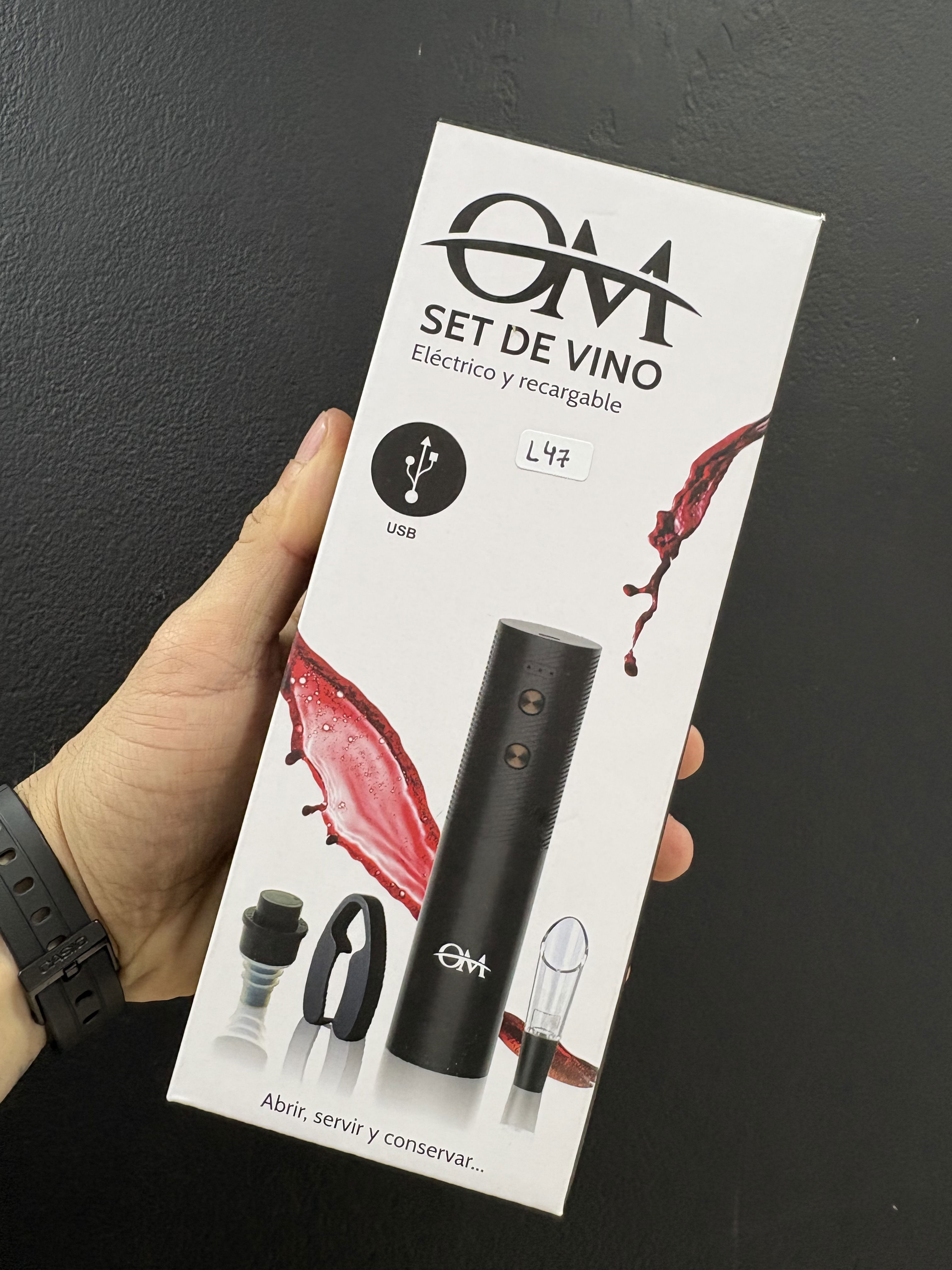 SET VINO SACACORCHO ELÉCTRICO OM: La Elegancia al Abrir tus Botellas Facilita la apertura de tus botellas de vino con este elegante sacacorchos eléctrico. Diseñado para extraer corchos sin esfuerzo en solo segundos, es el complemento ideal para cualquier amante del vino.