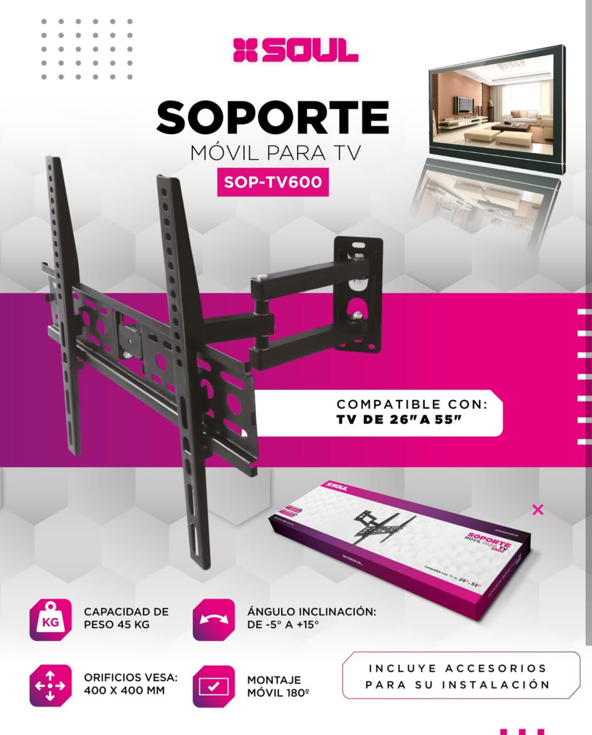 Marca: Soul- Modelo: SOP-TV600- Especificaciones- Lugares de montaje: Pared Movil- Material: Acero.- Montaje: Movil.- Es inclinable: SI- Angulo de Inclinacion: de -5 a +15°- Orificios Vesa:400x400mm- Compatible con: TV DE 26" A 55"- Es articulado: No- Es fijo: NO.- Soporta hasta 45kg.- Incluye accesorios de instalacion.