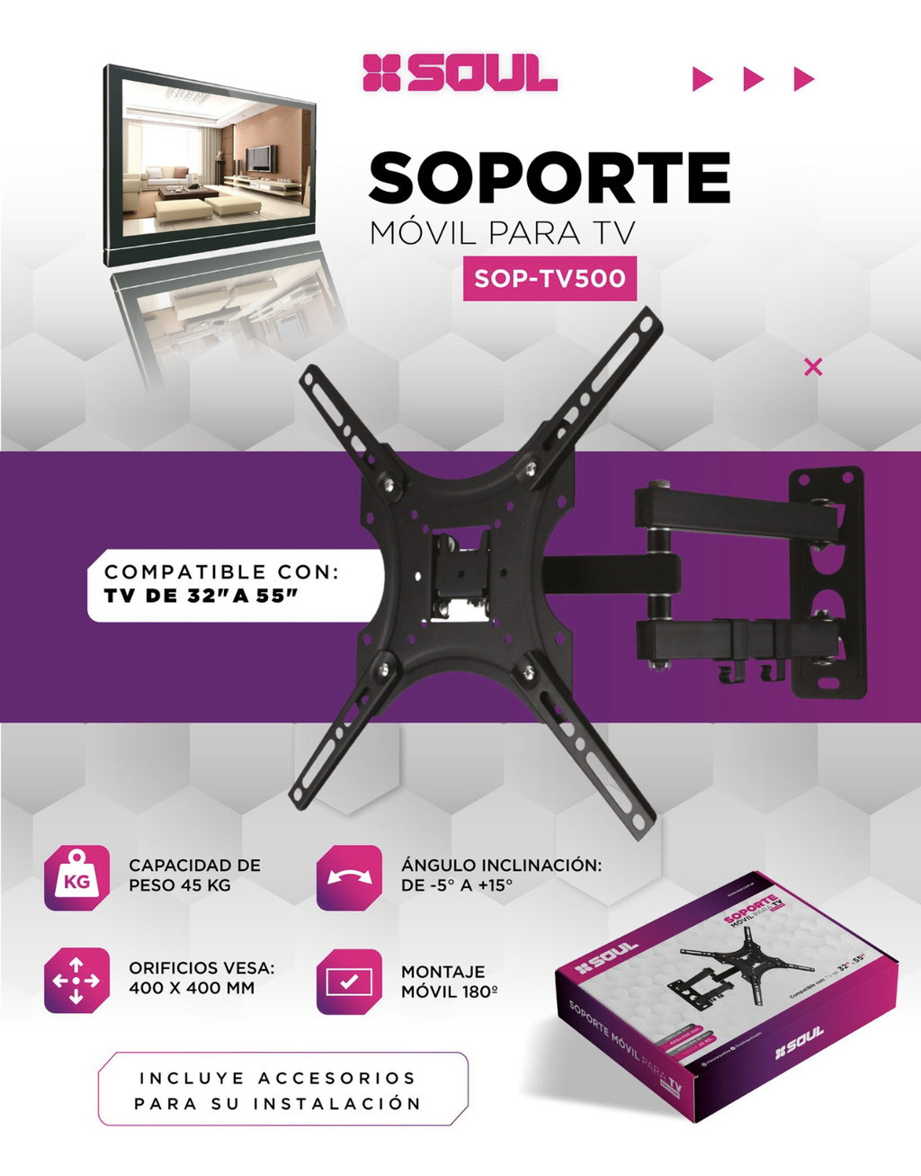 El soporte Soul SOP-TV500 te permite montar tu TV de forma segura y flexible. Ideal para lograr el mejor ángulo de visión, su diseño robusto y elegante combina con cualquier ambiente