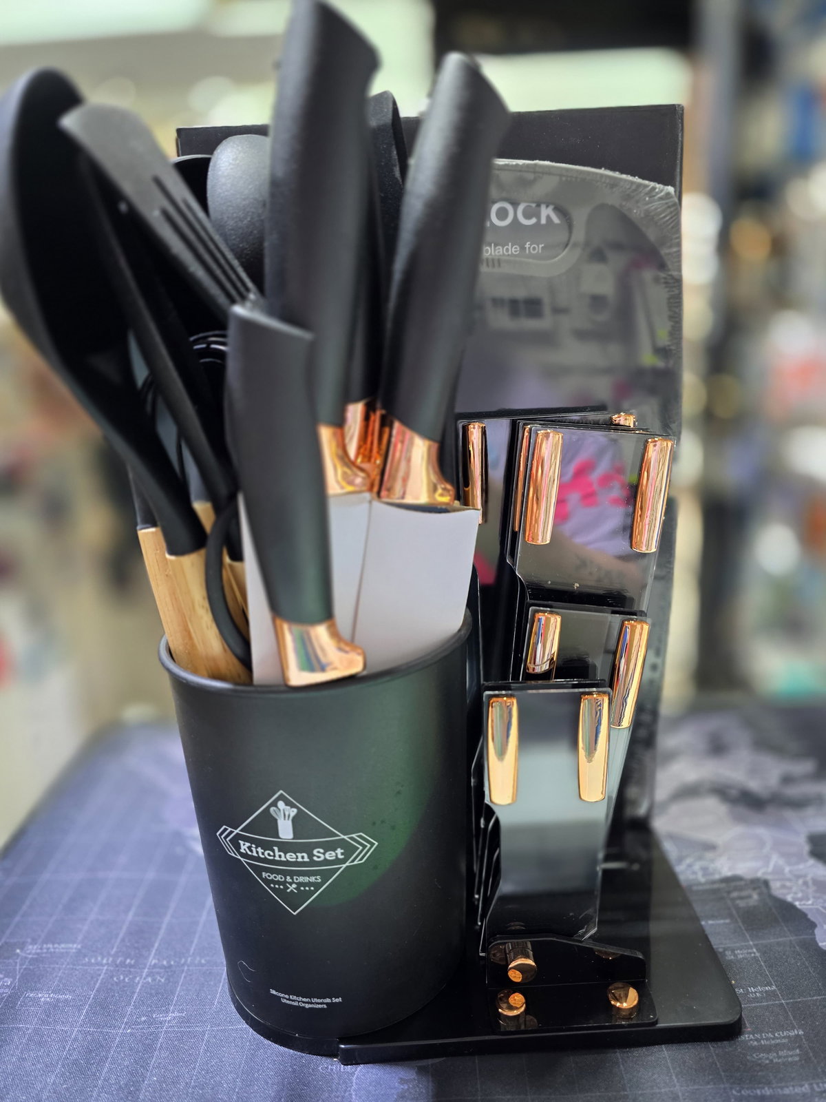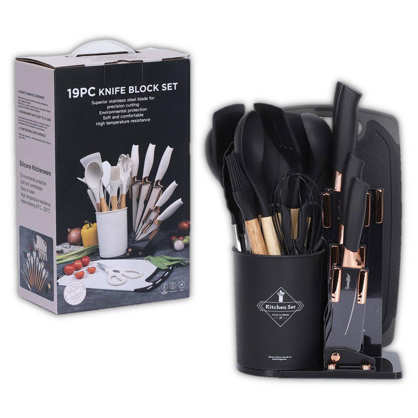 Eleva tu experiencia culinaria con el Set De 19 Utensilios De Cocina de Knife Block Set. Diseñado para los amantes de la cocina, este conjunto incluye una variedad de utensilios que combinan funcionalidad y estilo. Cada herramienta cuenta con un mango de madera ergonómico que proporciona un agarre cómodo y seguro, mientras que las puntas de silicona son perfectas para no dañar tus utensilios de cocina y asegurar un uso prolongado.