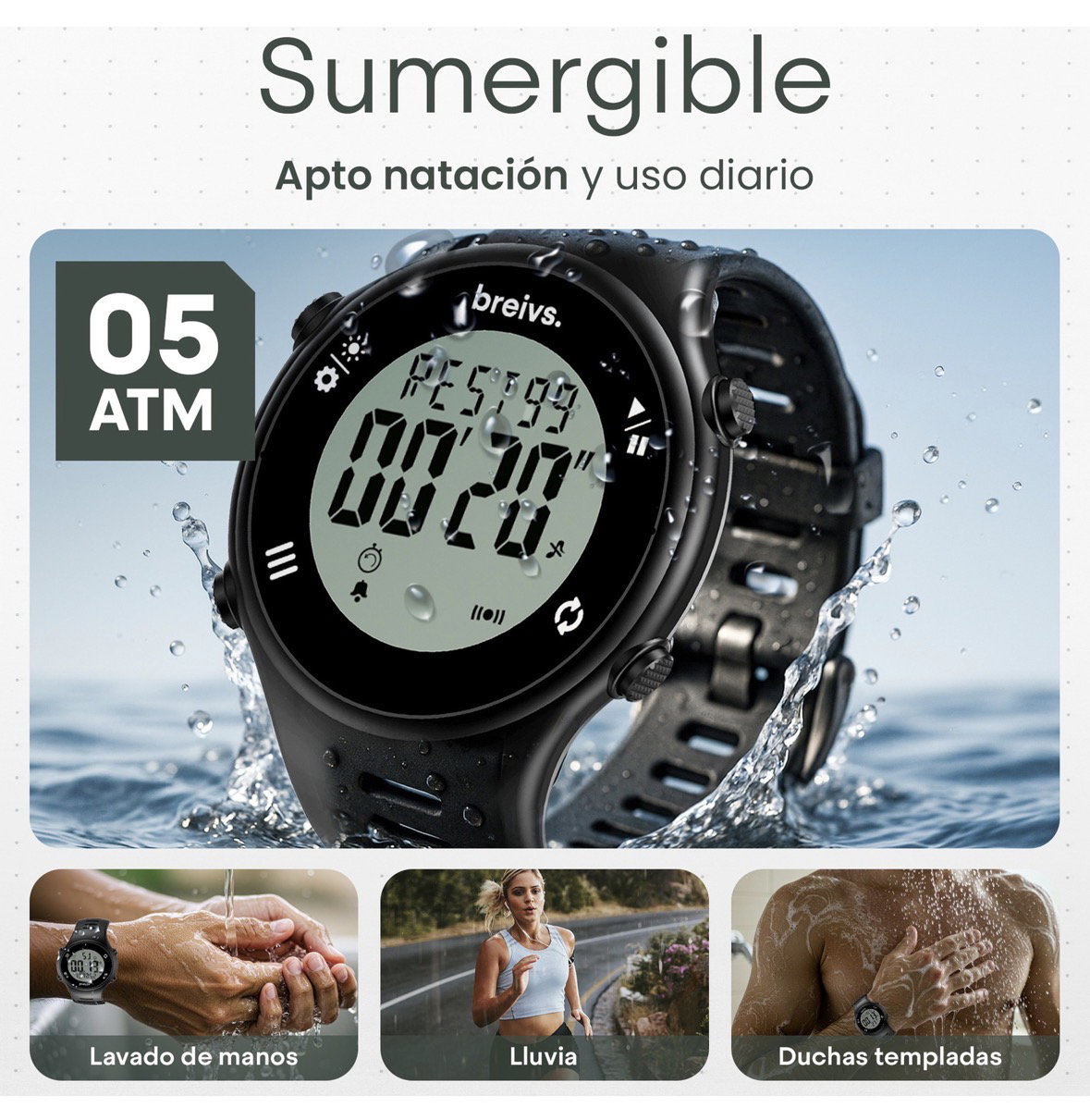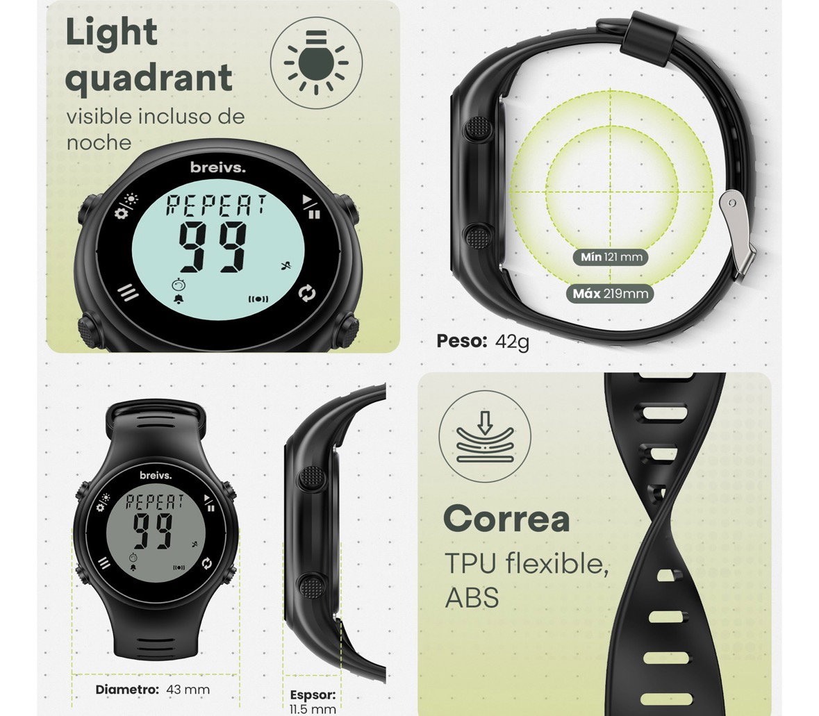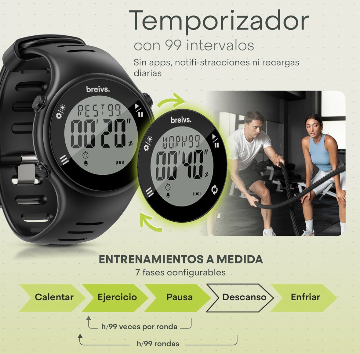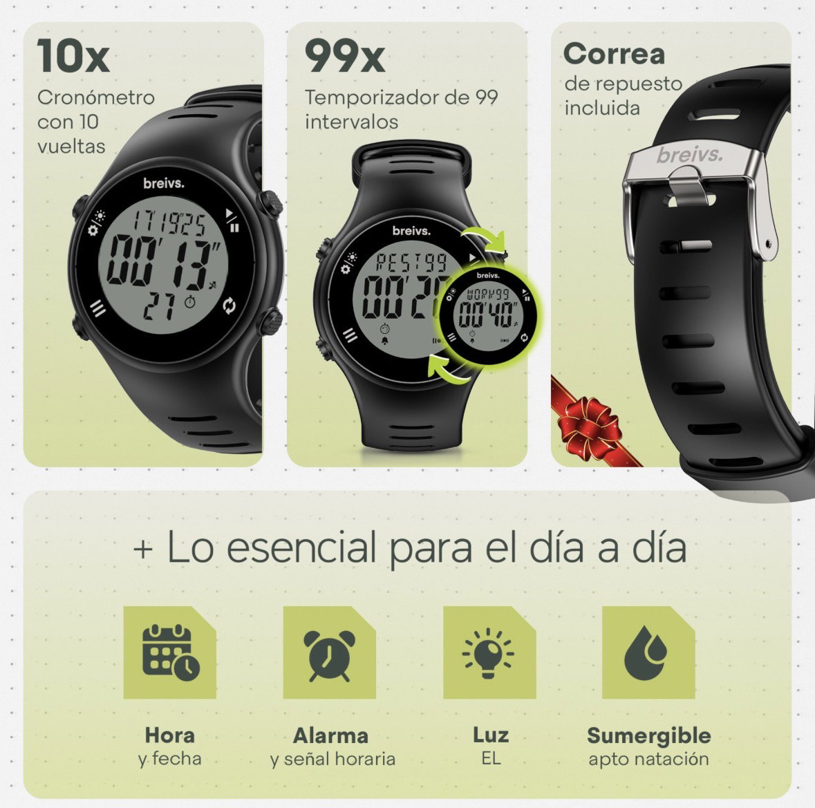 Reloj Digital BREIVS de hombre y mujer con malla extra de repuesto • Con todo lo esencial para el día a día + funciones de entrenamiento avanzadas • Temporizador de cuenta atrás ultra configurable con 99 intervalos y 7 parámetros editables (calentamiento, trabajo / pausa, repeticiones, sets, breaks y recuperación) • Cronómetro deportivo con 10 memorias de vueltas y precisión de 1/100s • Hora, fecha, luz, alarma, señal horaria • Liviano, cómodo y sumergible 5 ATM • Diámetro 43mm - Espesor 11,5mm - Peso 42g » Entrenamientos a medida sin apps, notistracciones ni recargas diarias. » Perfecto para Tabata, Rutinas de alta intensidad HIIT, Crossfit, Gym en casa, Enfoque pomodoro o usar en la cocina. » Diseño intuitivo: Reloj mujer y hombre con botones acompañados por íconos y pantalla nítida de fácil lectura. Ajustes simples desde el primer uso. Incluye manual en español. » Malla de repuesto incluida: Si vos no te pones límites, tu reloj tampoco debería hacerlo. Flexible, cómoda y resistente por duplicado.
